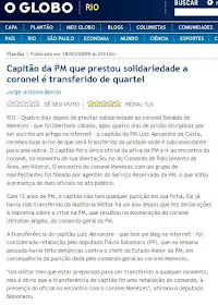 "O Cel-PM Ronaldo Menezes está em prisão disciplinar por texto postado em blog de outro oficial, usando direito constitucional de opinião, expressando deficiências da segurança pública no RJ, conhecidas e atestadas no cotidiano das pessoas.